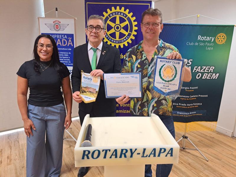A reunião do Rotary Lapa, realizada na quarta-feira, 4, na sede da ACM Lapa, sob a presidência de Sérgio Prezzoti, teve como palestrante Frans Wennich, que falou sobre como criar conexões humanas poderosas em um mundo cada vez mais desconectado. Após a palestra, Wennich recebeu certificado pela participação das mãos do presidente e houve a trocas de flamulas dos clubes. Taambém estava presente no almoço a assistente do palestrante, Adelaide Cristina Alves dos Reis. (Foto: Samuel Barcellos)